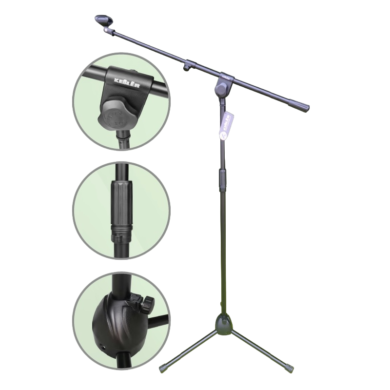 • Tipo de Soporte: Pedestal de micrófono con trípode y brazo jirafa (boom).